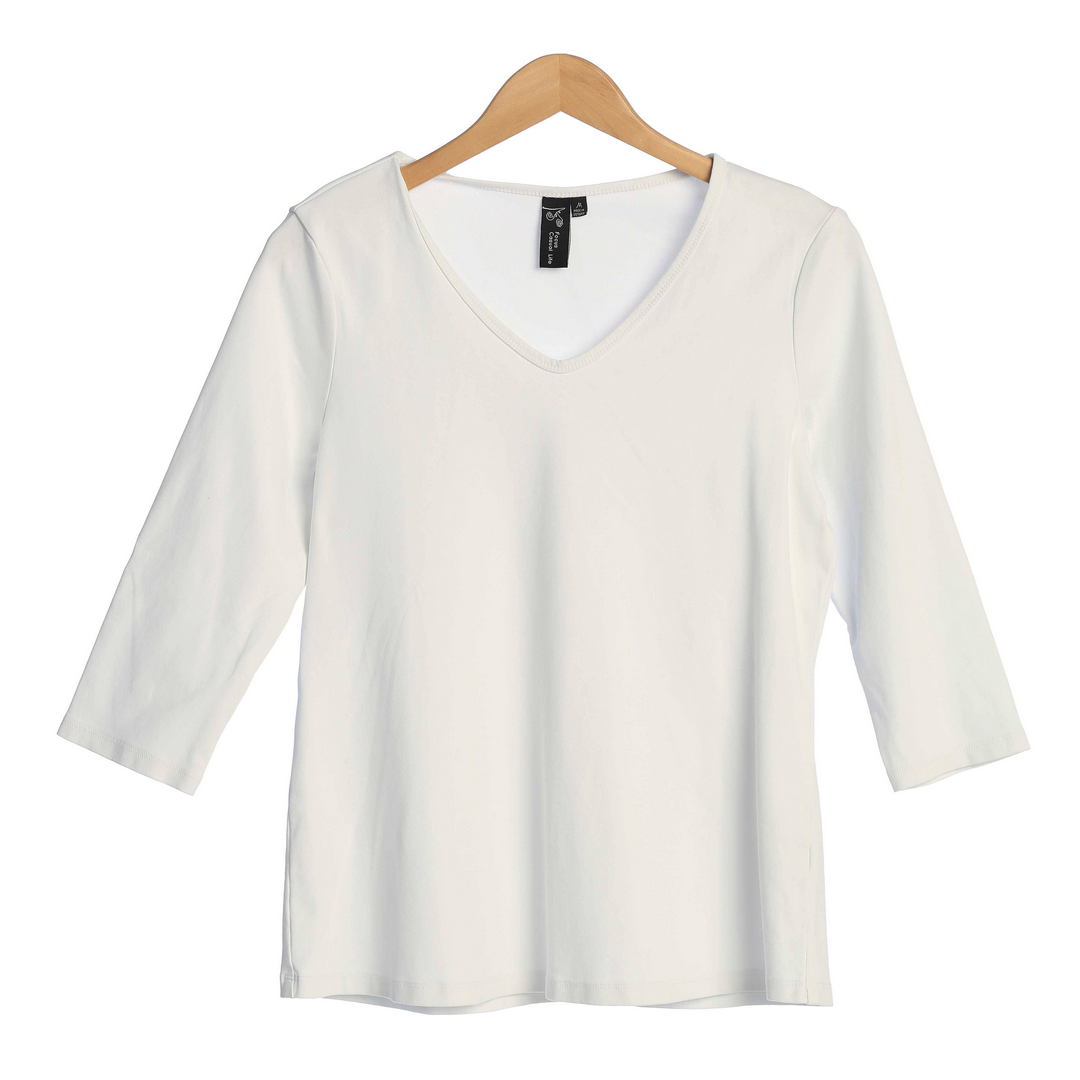 This three-quarter sleeve tee is crafted from soft cotton rib with a hint of stretch. It's designed for ease with a clean-lined V-neckline and modern fit.