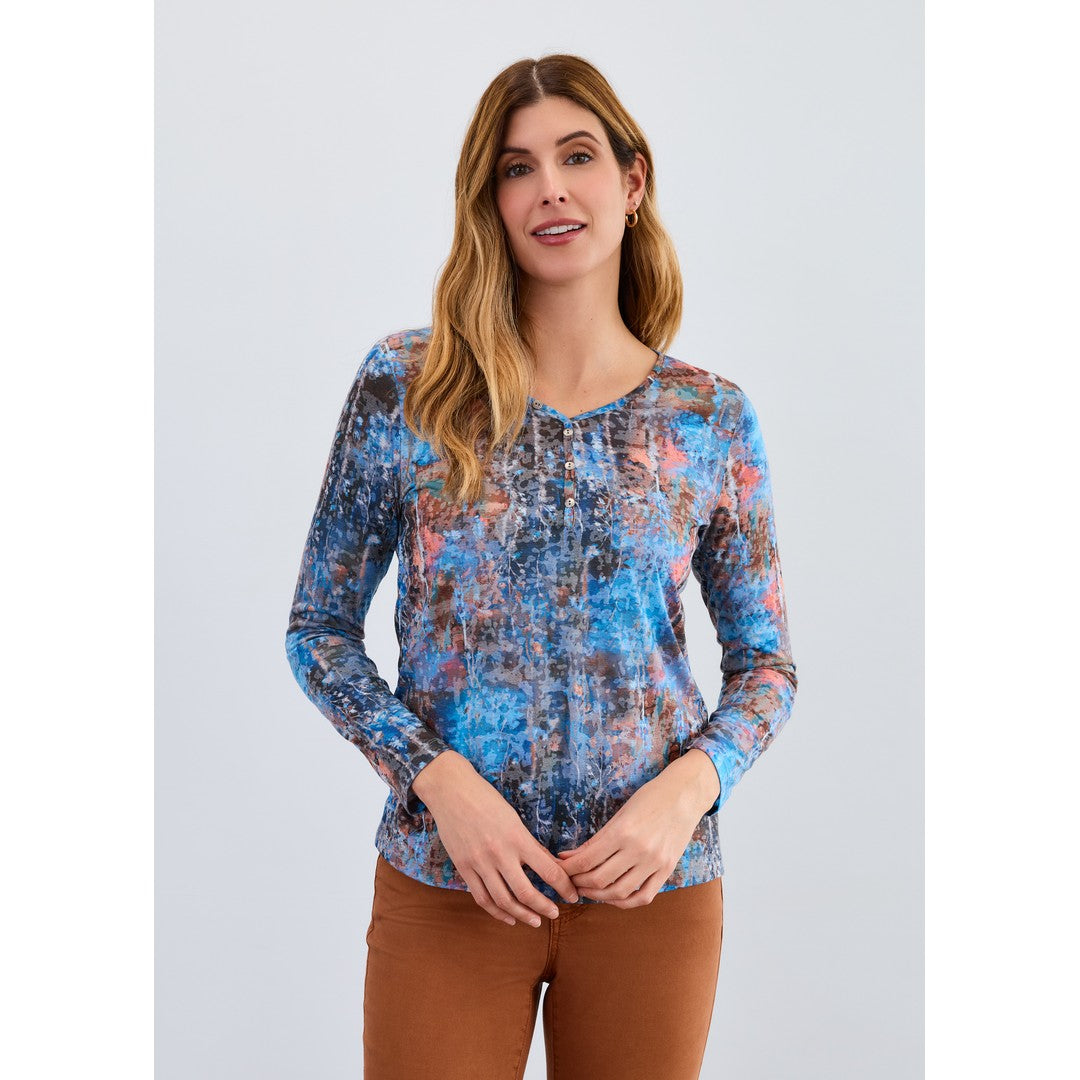 This top is like your favourite abstract painting—layered, moody, and full of surprises. The rich mix of sapphire blue, rust, and charcoal creates a wearable palette that instantly elevates any outfit, while the delicate button detail adds just a touch of polish.