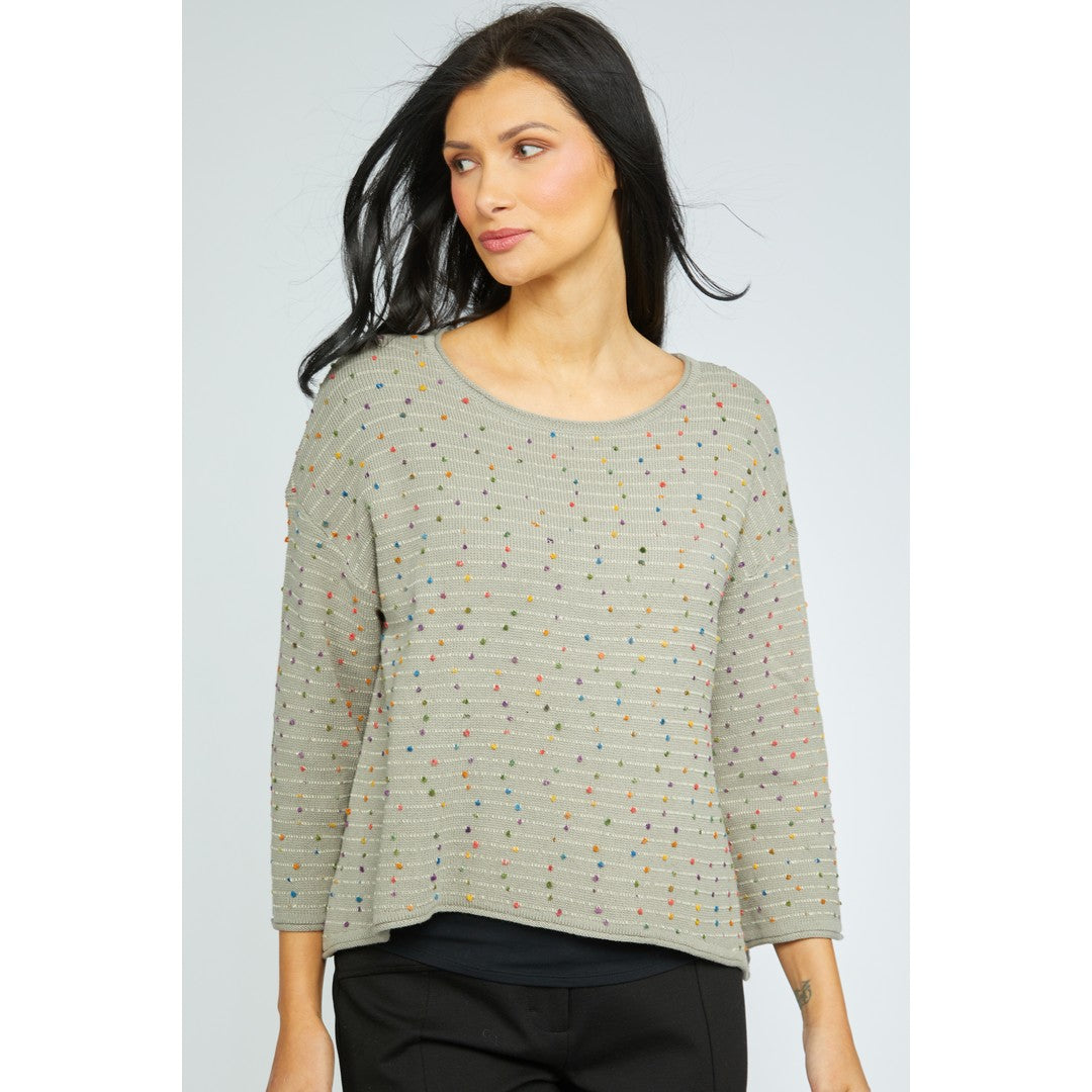 Add a playful pop of color to your everyday look with this lightweight cotton pullover. The textured knit is sprinkled with cheerful multicolored mini dots, giving it a fun yet refined feel. Designed with a relaxed silhouette, scoop neckline, and three-quarter sleeves, it’s the perfect blend of comfort and style. Pair it with denim for casual weekends or dress it up with tailored pants for a modern, artsy vibe.