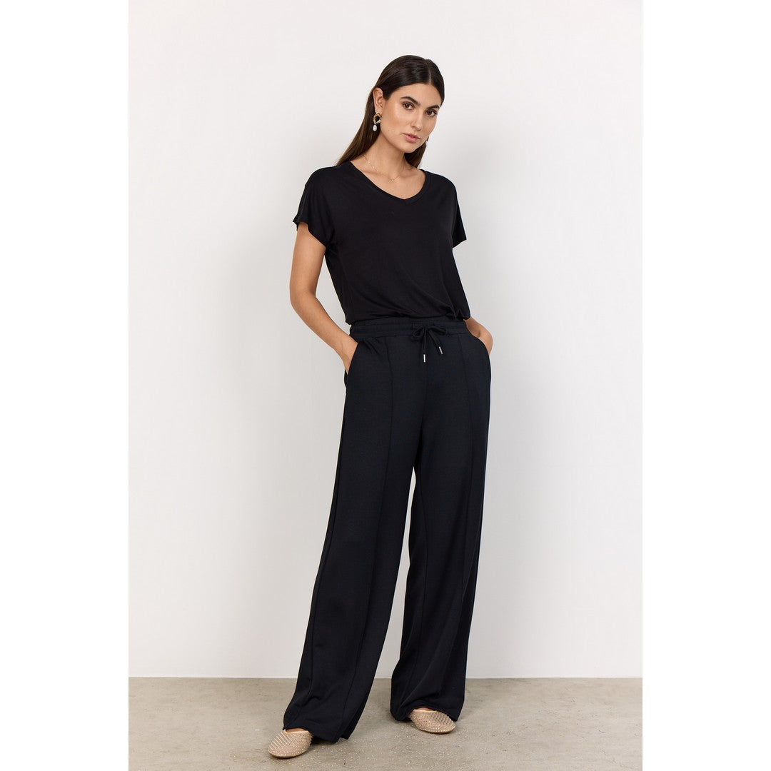 | Description EN: SC-BANU 265 Pants are crafted with 48% Modal, 48% Polyester, and 4% Elastane. They feature an elastic waistband with drawstring and straight-leg design. Pair them with a classic t-shirt or a smart blouse for an elegant look. | |